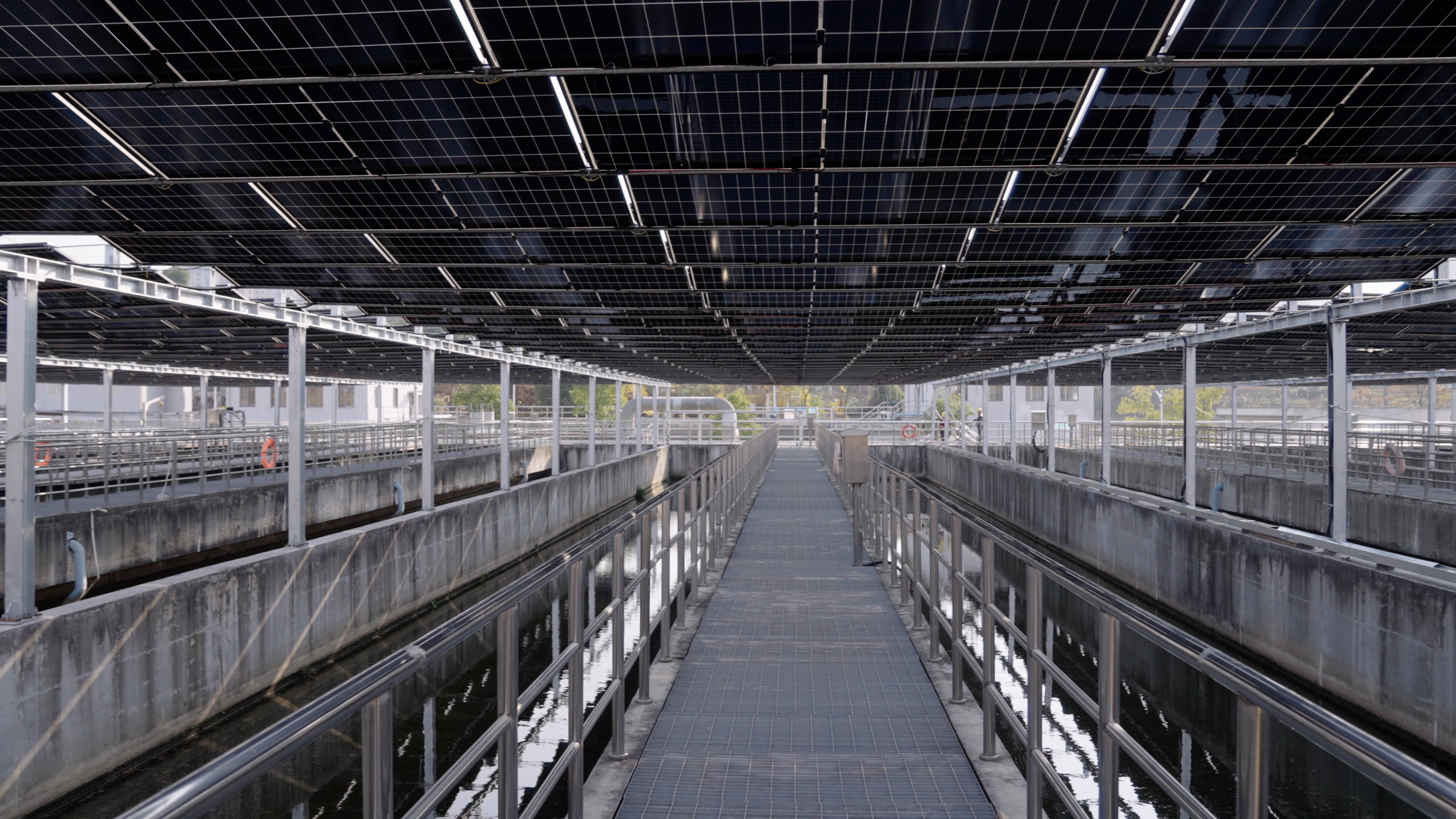 未来,一排排深蓝色的光伏组件将如羽翼般铺展在水厂上方,与澄澈水流交相辉映,构成一幅“水光共舞”的和谐画卷。