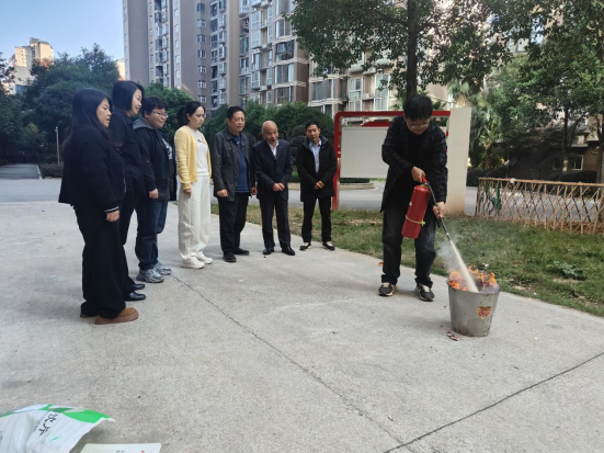 15时整,演练正式启动。艾叶模拟的烟雾弹释放后现场浓烟弥漫,警报声同步拉响,全体员工迅速响应,捂住口鼻,按预定方案分左右两排沿疏散楼梯有序撤离,全程无推挤、无喧哗,快速抵达指定集合点后,工作人员即刻清点人数确认全员安全。疏散演练结束后,灭火演习接续开展,教员现场演示干粉灭火器“提、拔、握、压”四字要诀,员工分组实操,面对铁桶中燃烧的易燃物品沉着处置,切实掌握了初期火灾扑救技能。